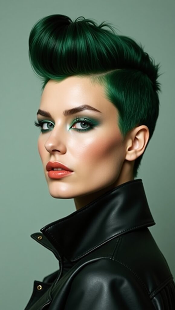- Description: A bold, dark green Pompadour with high volume and sharp contrast on the sides for an edgy, daring look.