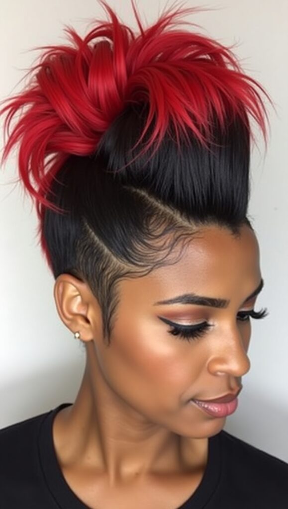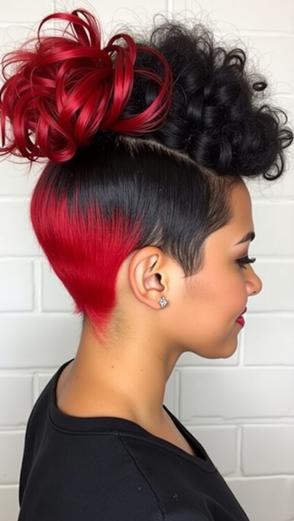 - Description: A bold ombre from black roots to bright red tips, adding drama and volume to the Pompadour.
