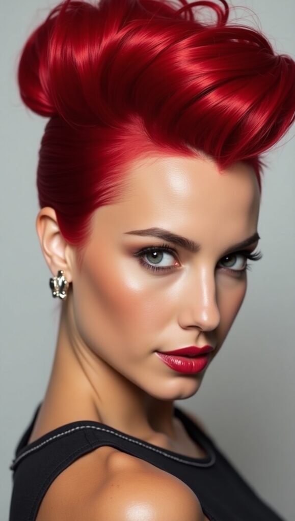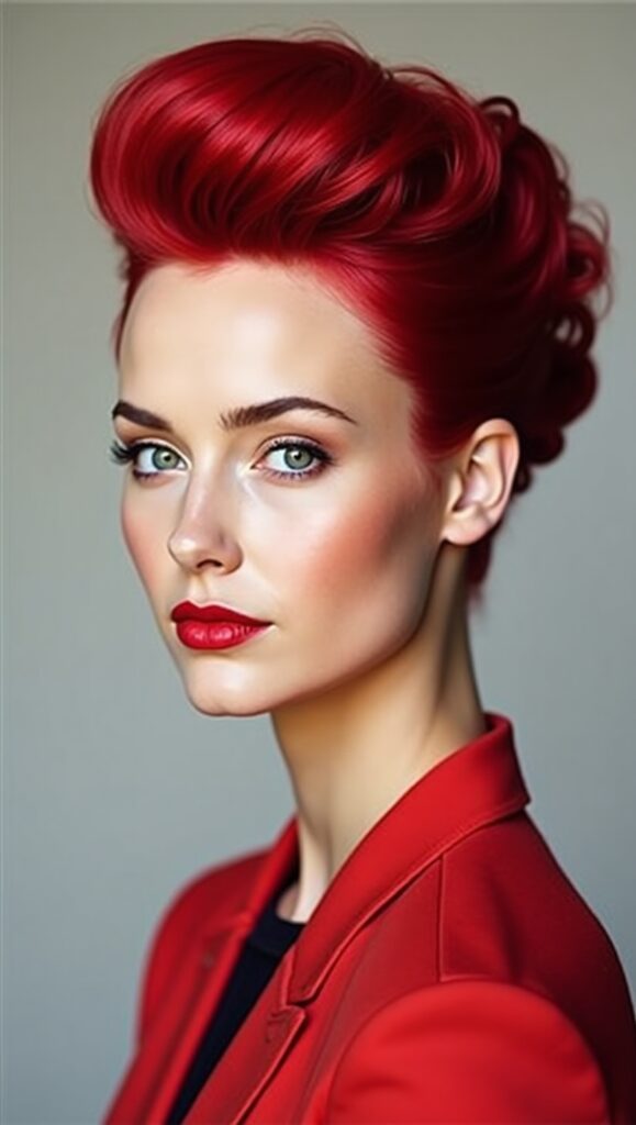 - Description: A bright cherry red Pompadour with defined volume, adding an energetic pop of color.
