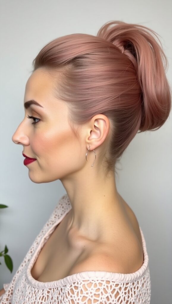 - Description: A chic, soft rose gold Pompadour with smooth volume for an elegant and stylish look.