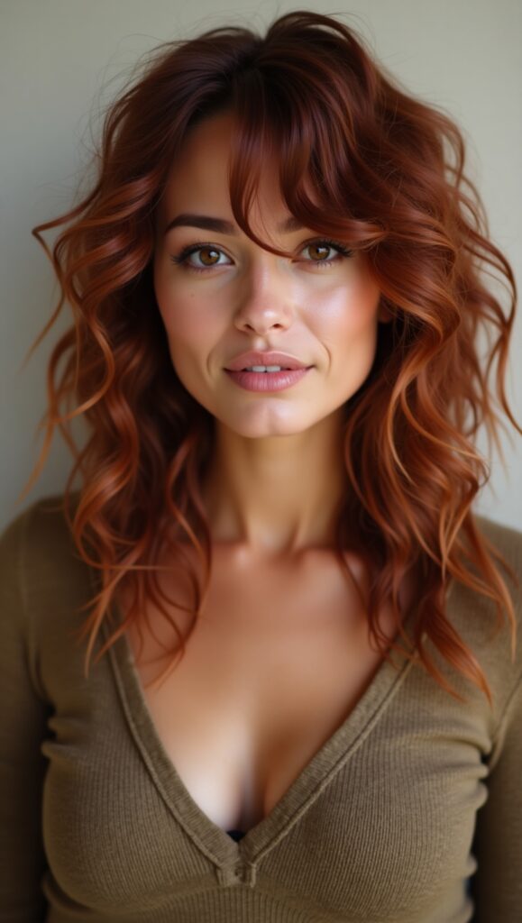 - Description: A deep auburn base with textured, tousled volume on top, adding a natural, warm vibe.