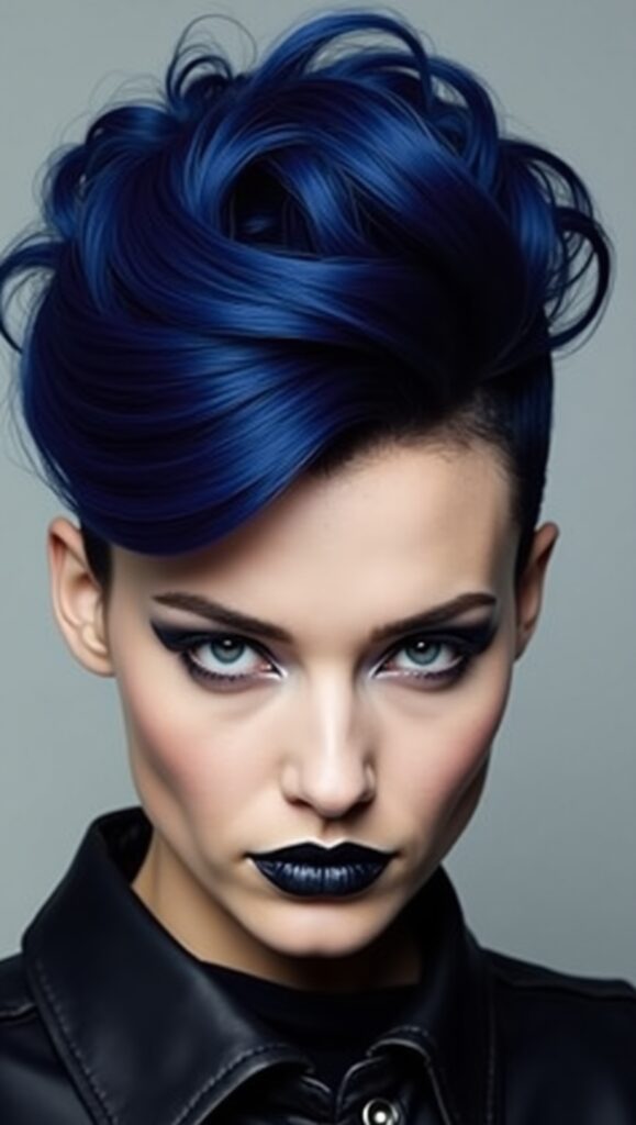 - Description: A deep, midnight blue Pompadour styled with volume and height at the crown for a dramatic look.