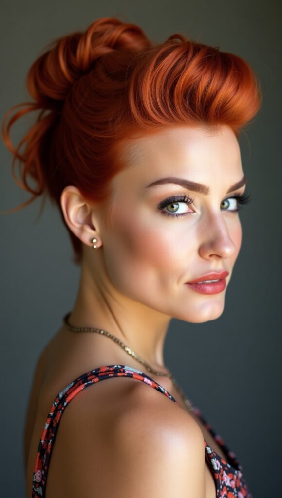 - Description: A fiery copper Pompadour with a smooth, structured top, exuding confidence and vibrancy.