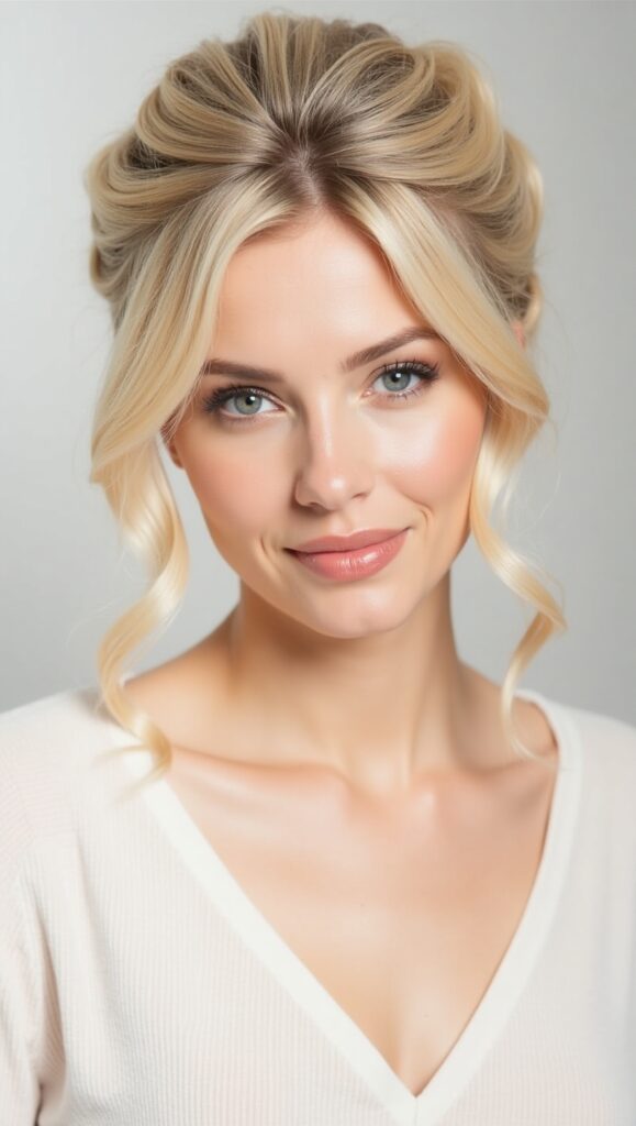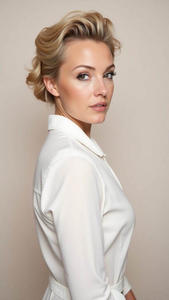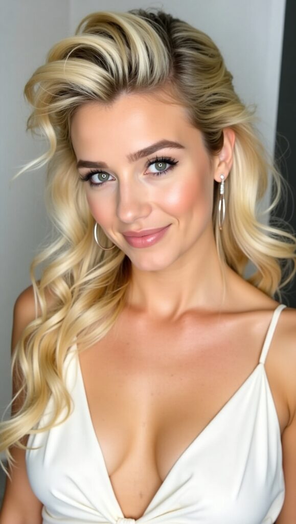- Description: A soft, champagne blonde Pompadour with relaxed waves, perfect for a chic, understated look.