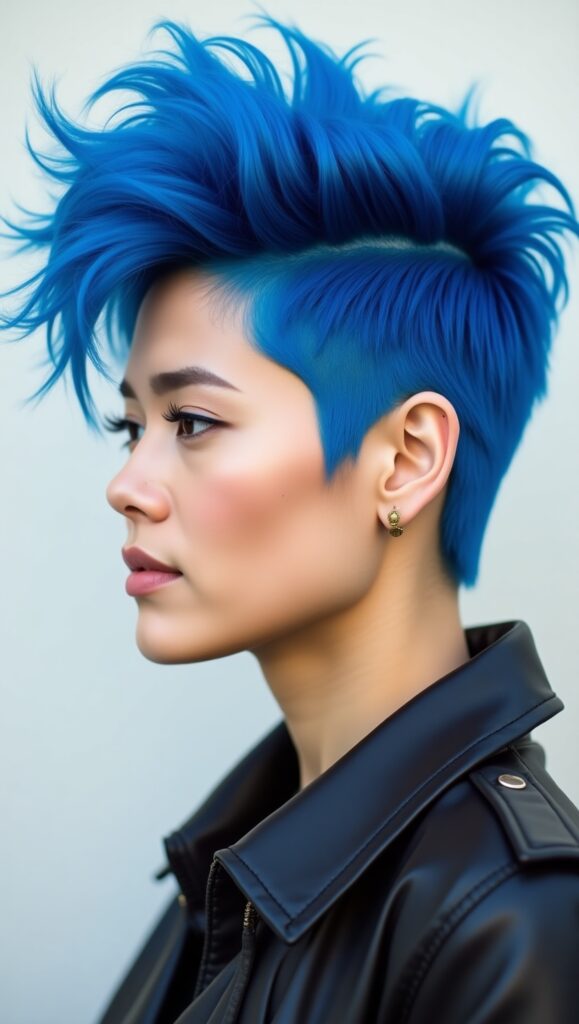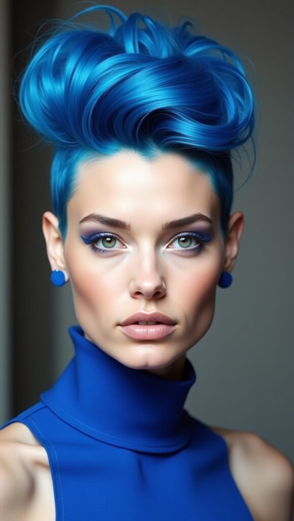 - Description: A striking electric blue Pompadour with sharp edges and volume, creating a bold, fashion-forward look.