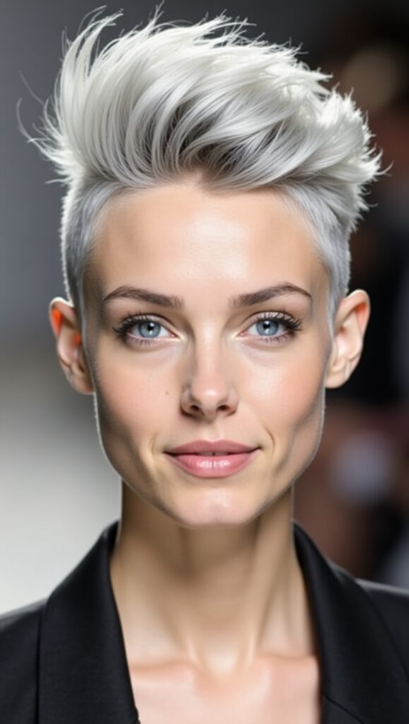 - Description: A striking silver Pompadour with clean, faded sides to create a bold, modern contrast.