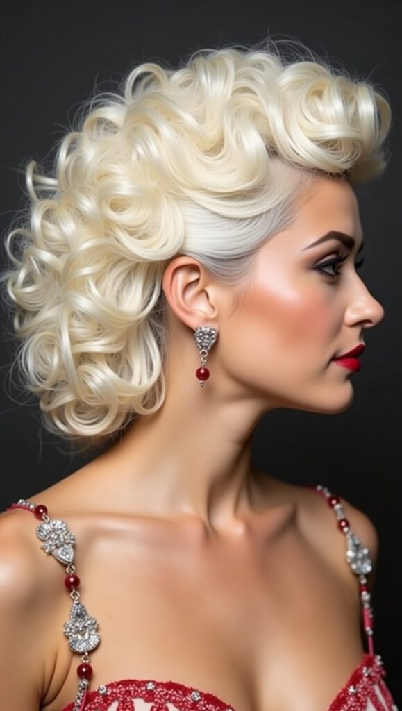 - Description: A voluminous Pompadour with loose curls, adding movement and dimension to platinum blonde hair.