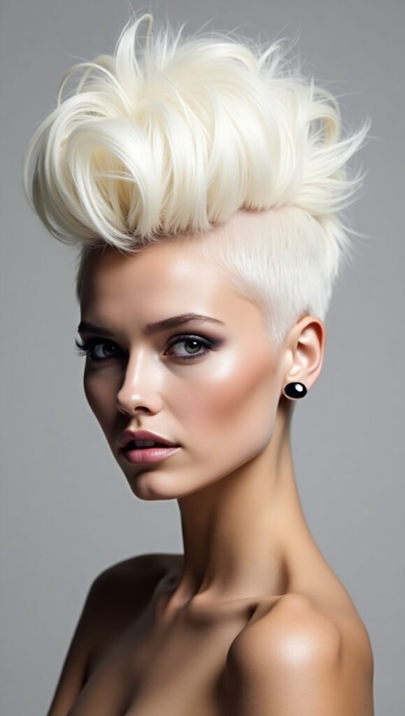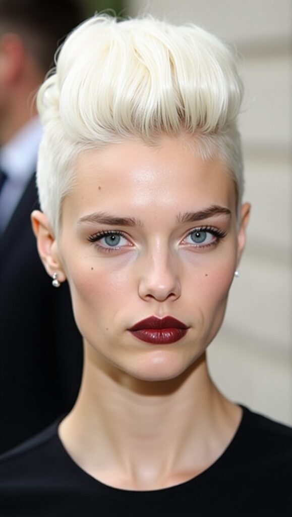- Description: Almost platinum white blonde hair styled into a structured, high-volume Pompadour.