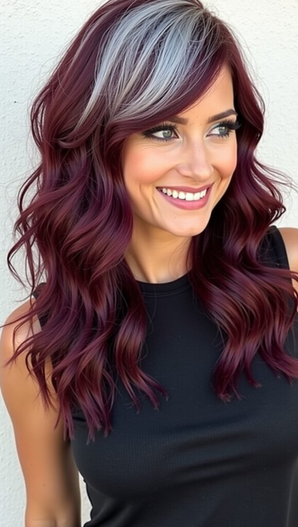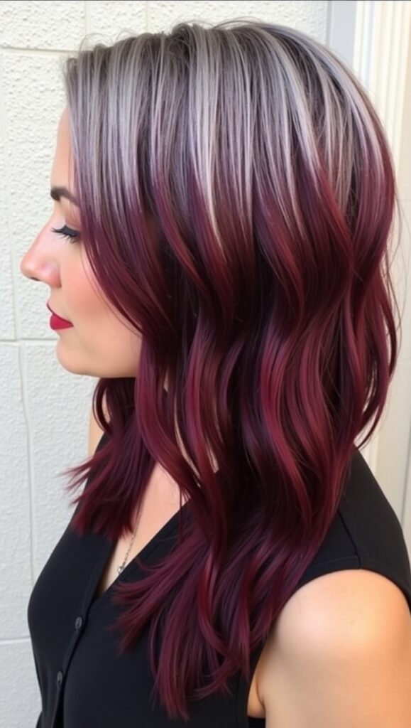 - Description: Burgundy hair with silver tips at the crown, creating a striking blend of warmth and cool tones.