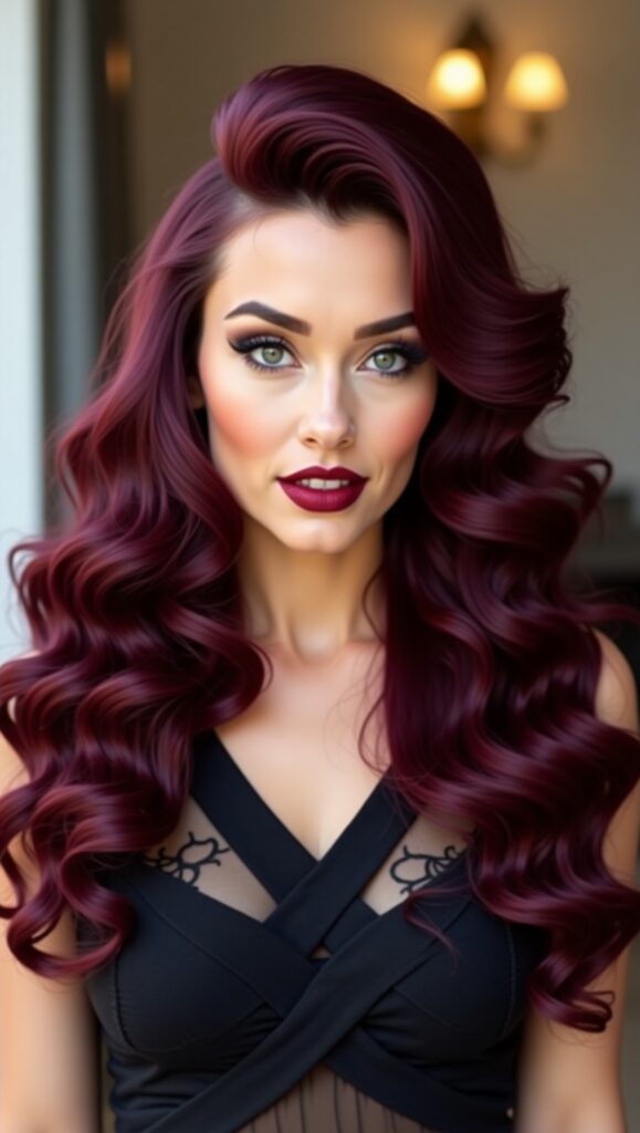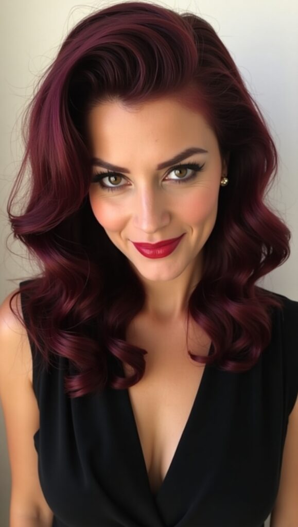 - Description: Deep burgundy hair styled into vintage-inspired waves with voluminous height at the crown.