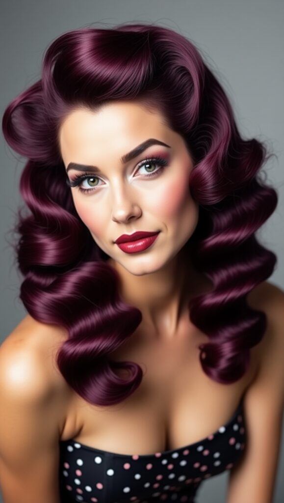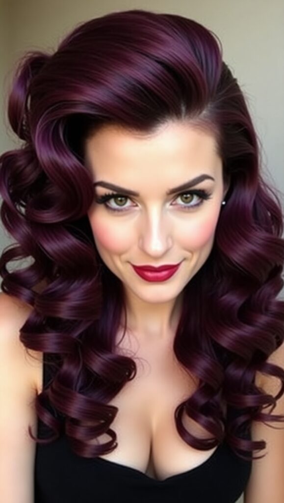 - Description: Deep plum-colored hair styled into pin-up curls with high volume at the top for a retro, glamorous finish.