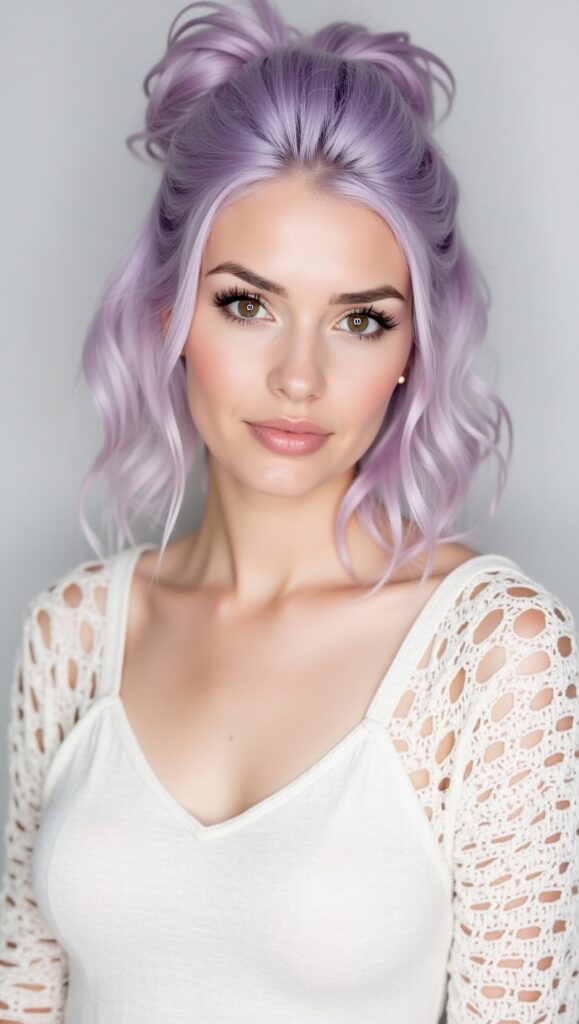 - Description: Soft lavender hair styled into a voluminous Pompadour, perfect for a feminine, delicate vibe.