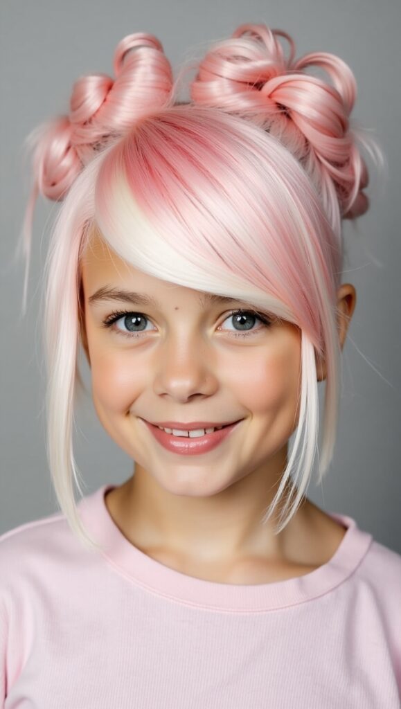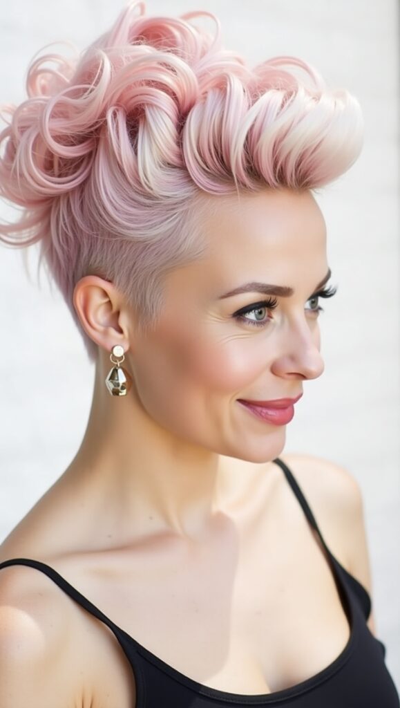 - Description: Soft pink hair styled into a voluminous Pompadour with platinum blonde tips, adding a playful and chic vibe.