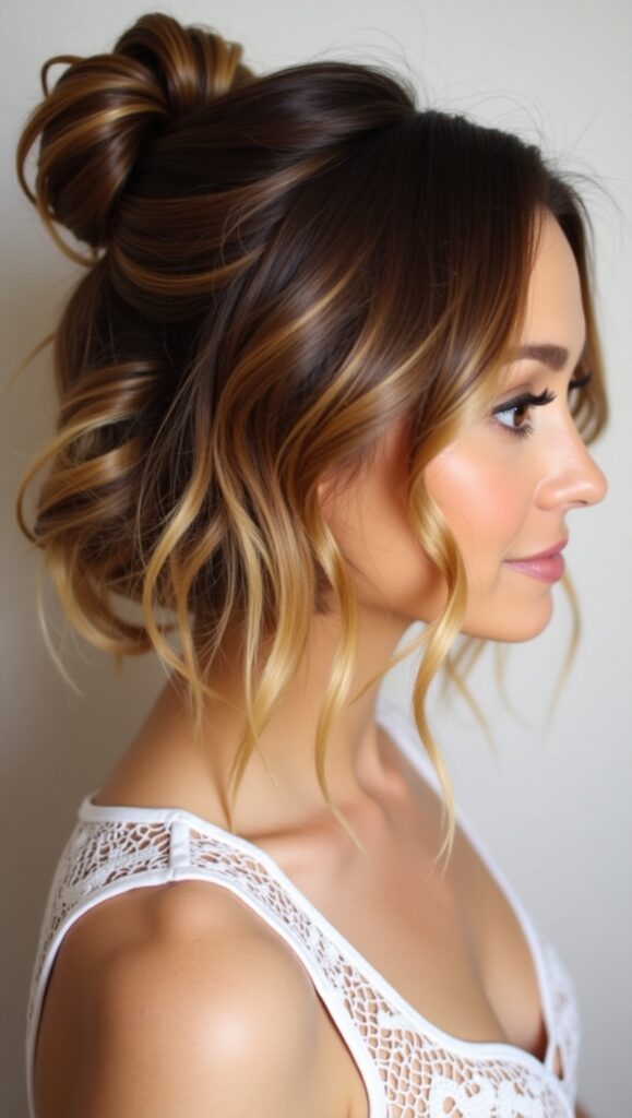 - Description: Warm caramel highlights blended into dark hair, creating a multi-dimensional Pompadour with natural volume.